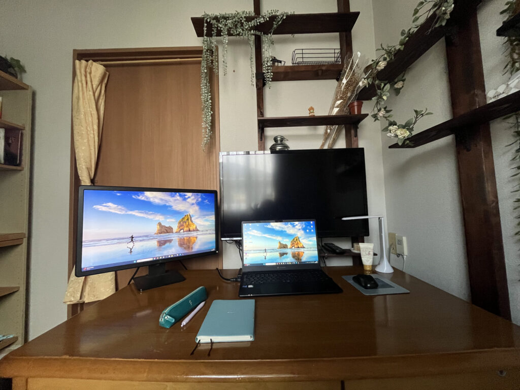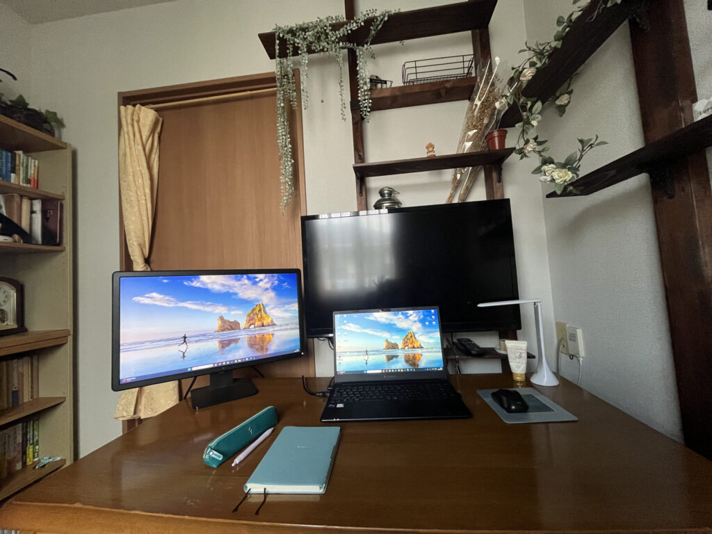 デュアルモニター環境は本当に便利で、手前のDellモニターとノートPCでメインの作業をして、後ろの大型TVでオンライン講座や動画を見るという使い方をしています。